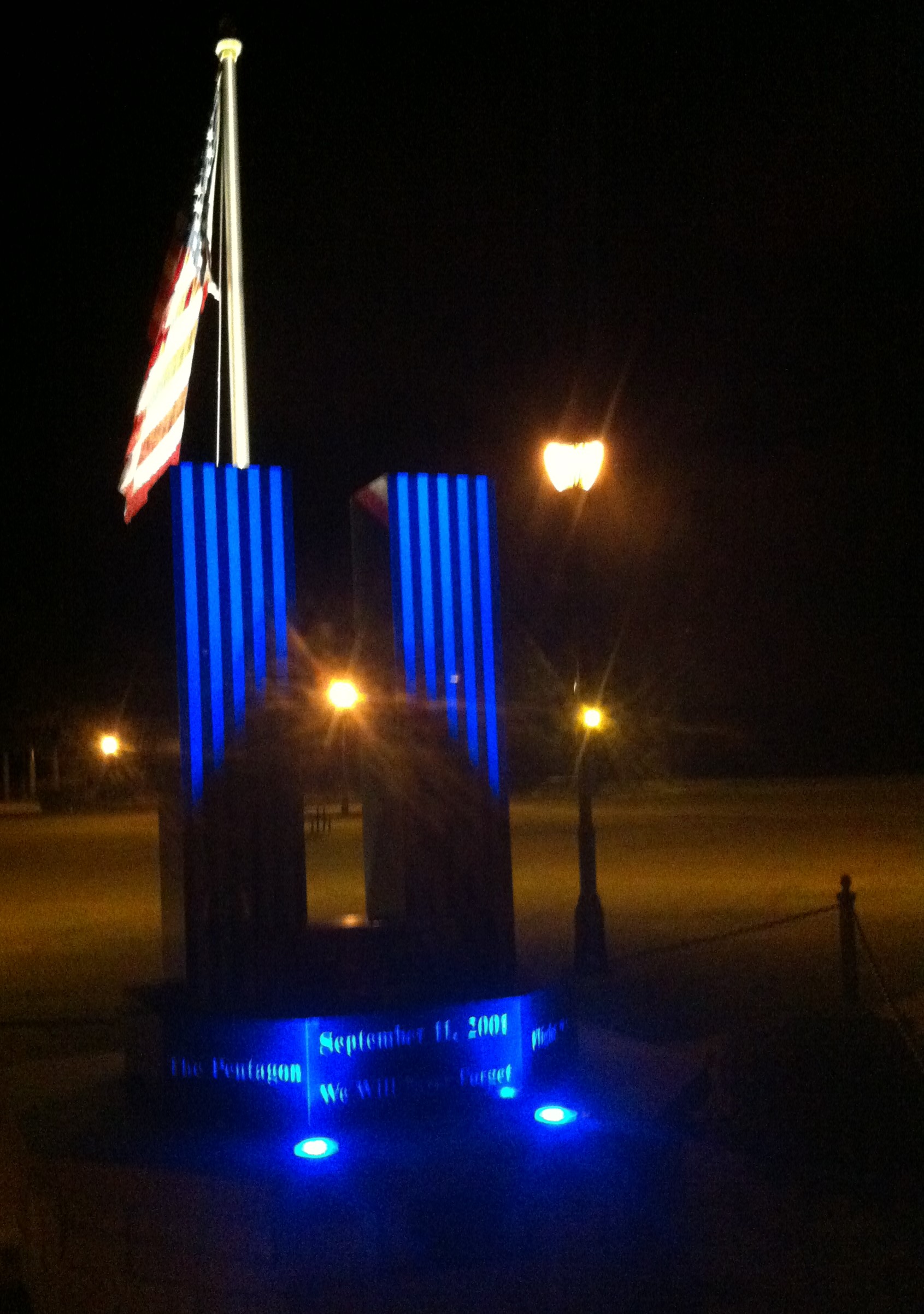 There it was. A small monument to 9/11. Tasteful and simple, and even at night it has a blue light illuminating the twin towers. On the left side is inscribed, “Pentagon” and on the right side, “Flight 93.”